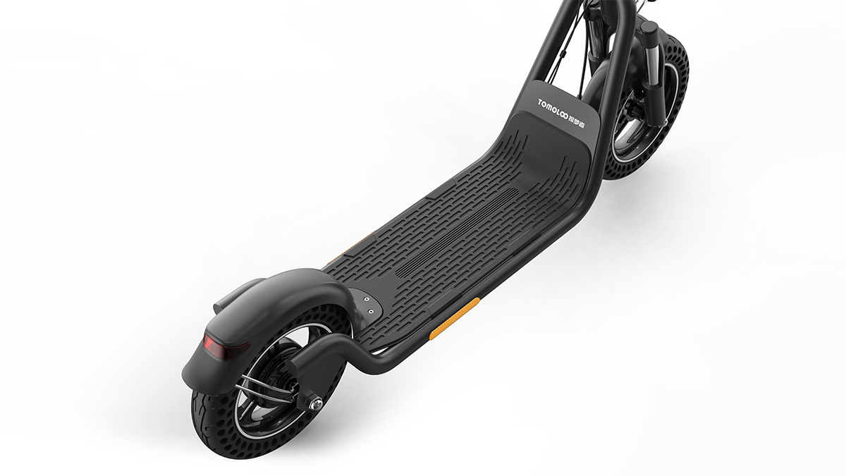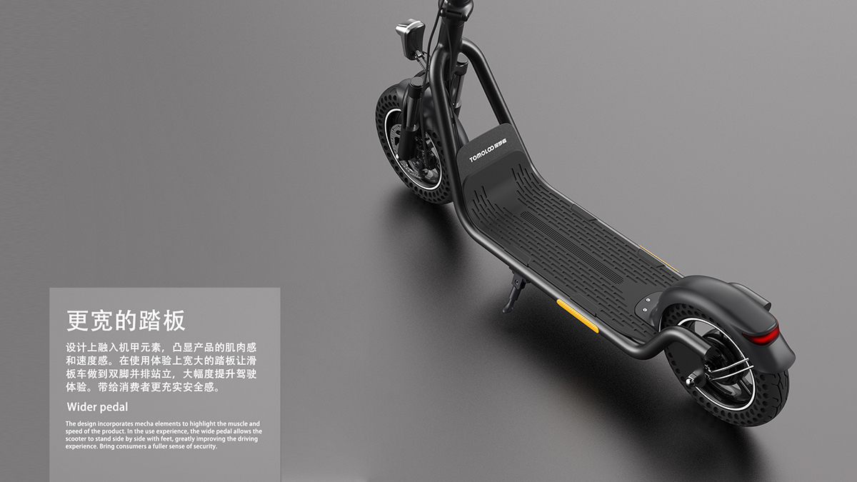12寸的輪胎相對于傳統(tǒng)滑板車,可以應(yīng)對更多變的路況。讓用戶在行駛過程中更加平穩(wěn),同時(shí)大輪胎也可以提升用戶的操控體驗(yàn),使得本產(chǎn)品具有更好的操控感。踏板面積的增加給操控滑板車方式提供了更多可能性,提升用戶的駕駛樂趣。