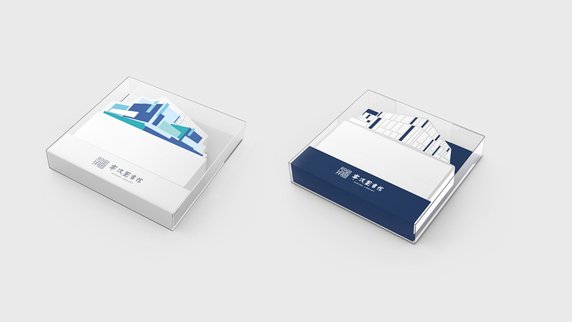 寧波市圖書館形象標識以藍、灰為主色調,整體風格融合傳統(tǒng)意蘊和現(xiàn)代化風格。此次寧波圖書館禮盒包裝設計根據(jù)圖書館形象標識為設計元素,展示了更加活潑,現(xiàn)代化的視覺效果。
