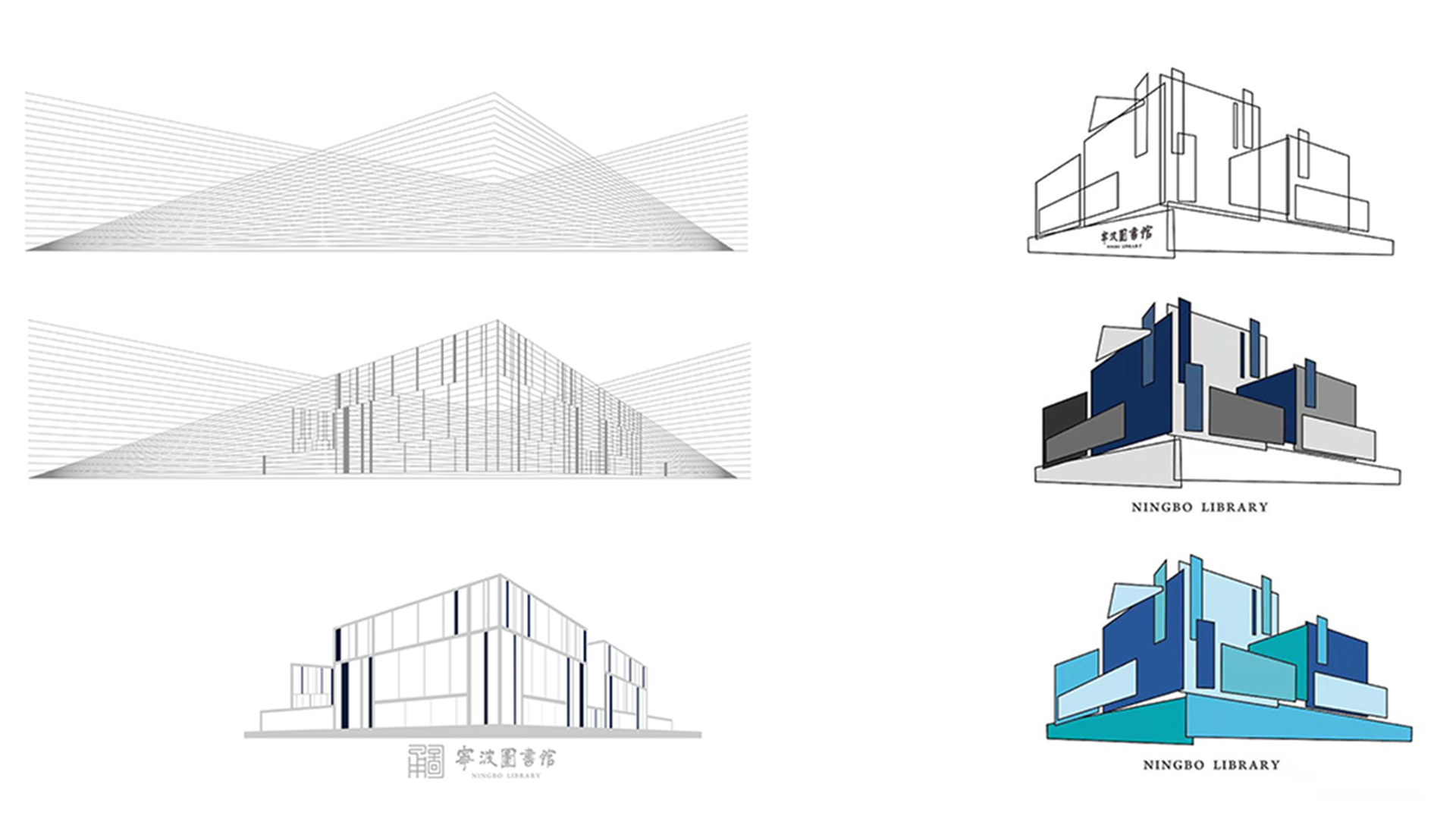 形式二:①利用建筑立面的縱橫透視線條,部分點綴深藍色的粗線條,塑造出圖書館嚴謹冷靜的一面,始終以一個堅定嚴肅的形象為廣大市民提供借閱服務。