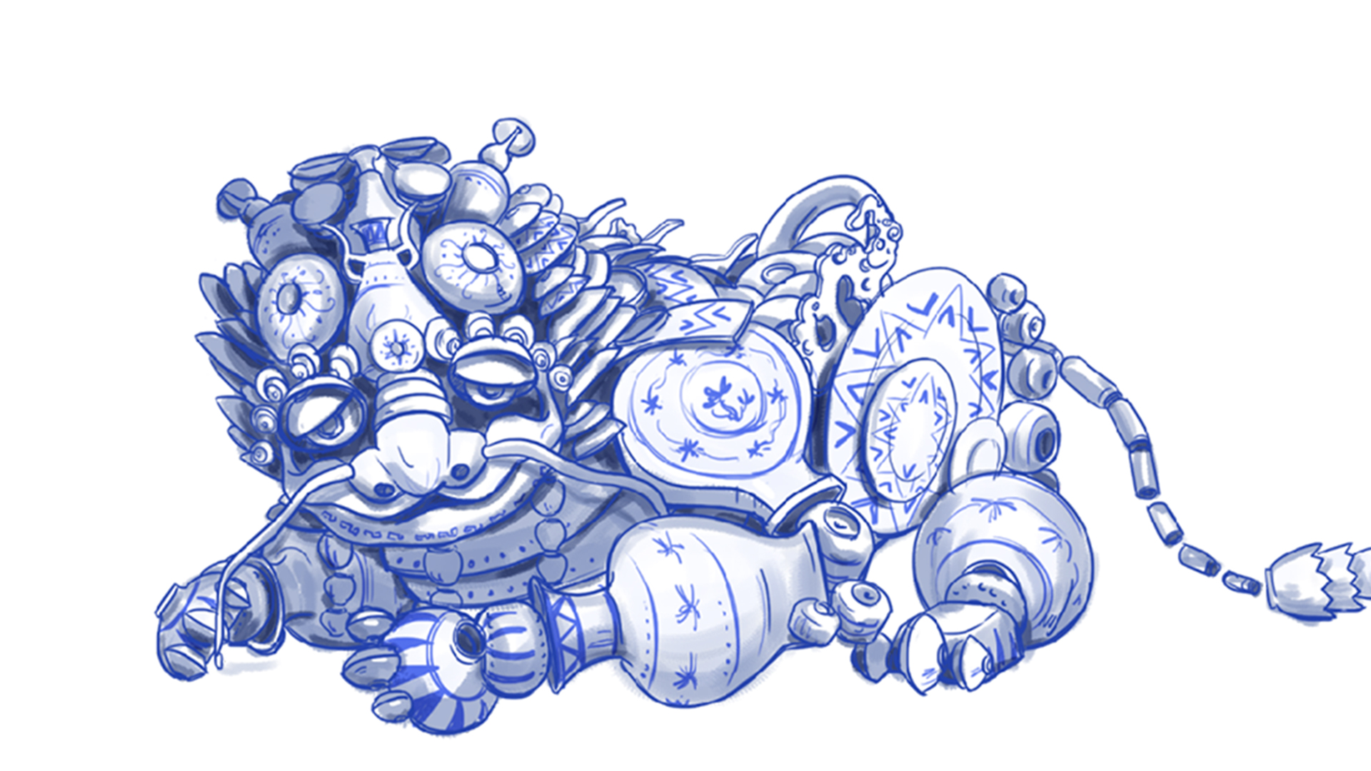 LONG是一只由著名御窯的瓷器構(gòu)成的瑞獸。LONG在瓷世界中掌管“瓷”之燒制,他的設(shè)計原型是“龍,組合他的瓷器原型主要選用清代“御窯”的代表作,特別是以造型技術(shù)見長的“雙聯(lián)瓶”、“各種釉彩大瓶”等器型拼合而成。御窯之集大成由“LONG”這一角色來演繹,也是從權(quán)力巔峰的視角對瓷文化進(jìn)行了另一個角度的詮釋。