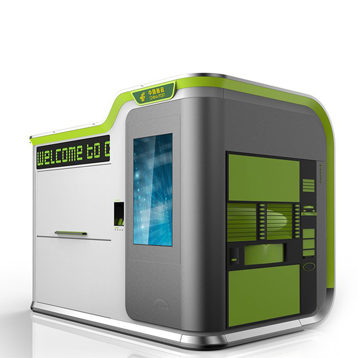 造型以現(xiàn)代簡約風(fēng)格為主,順應(yīng)現(xiàn)代市場和審美需求。簡潔的外觀、內(nèi)部流暢的曲線和燈光效果相呼應(yīng),凸顯產(chǎn)品的科技感同時又不顯得沉悶。多功能和模塊化設(shè)計更是人性化設(shè)計的主要體現(xiàn),由形式至意,從意到神韻,無不強調(diào)中國郵政的服務(wù)宗旨,以人為本。