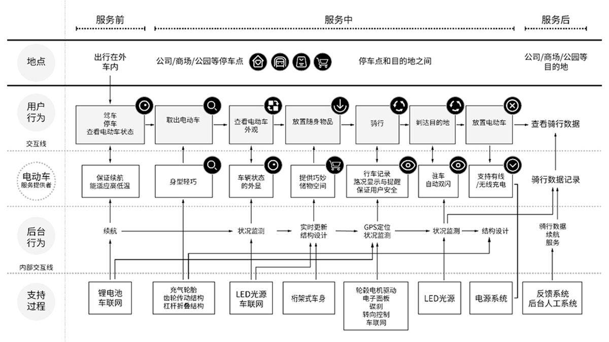 ? ? ? ? 設(shè)計(jì)團(tuán)隊(duì)站在mini電動(dòng)車的視角,把它看做一個(gè)人,去深入地拆解它會(huì)怎么看、怎么說(shuō)、怎么和用戶互動(dòng),如何成為用戶的貼心行程伴侶。繪制用戶體驗(yàn)地圖、服務(wù)藍(lán)圖是尋找優(yōu)化體驗(yàn)服務(wù)點(diǎn)的有效工具,根據(jù)體驗(yàn)流程圖中挖掘的機(jī)會(huì)點(diǎn),從產(chǎn)品服務(wù)、環(huán)境和傳達(dá)等多方面設(shè)定設(shè)計(jì)所要達(dá)成的目標(biāo)。