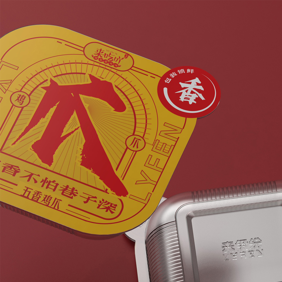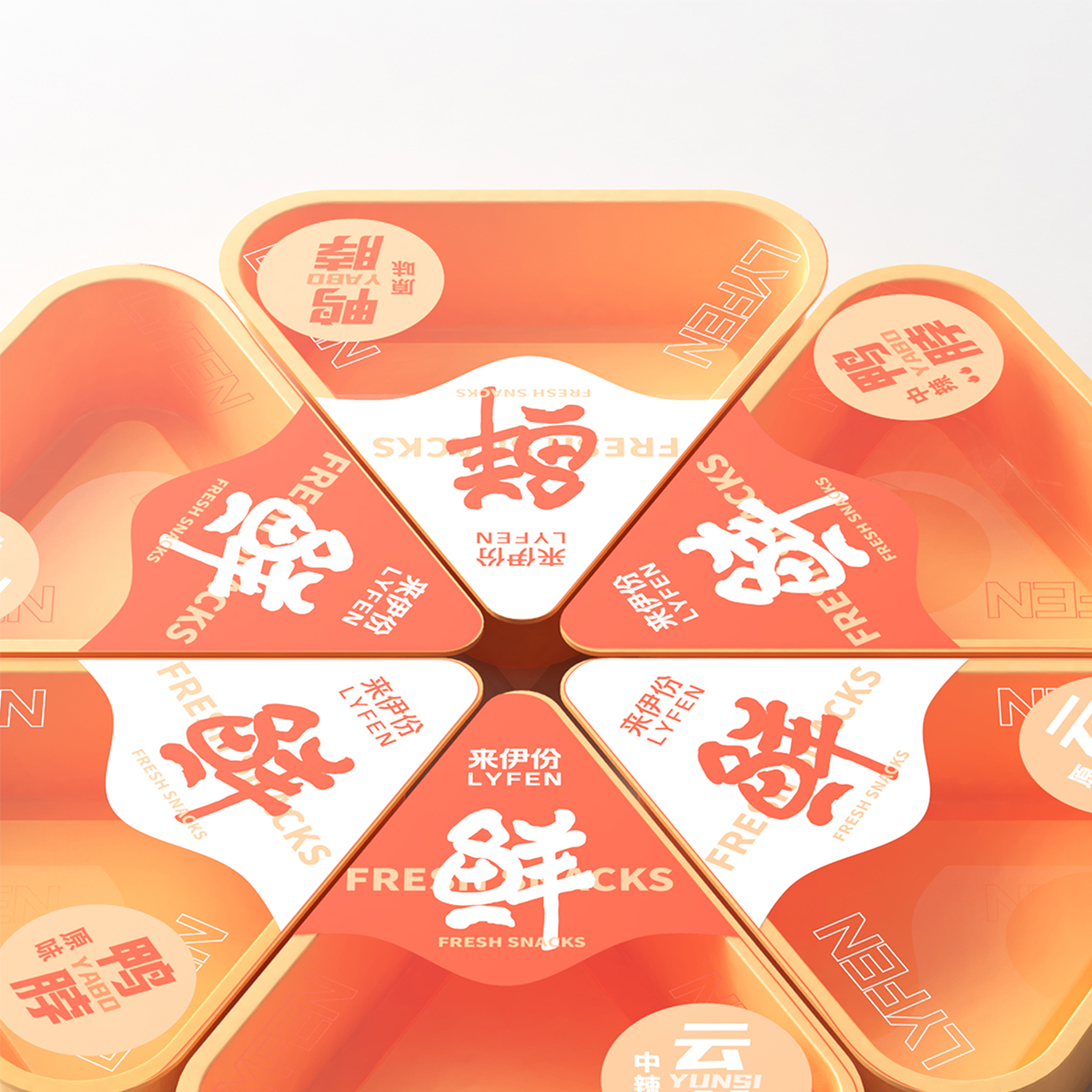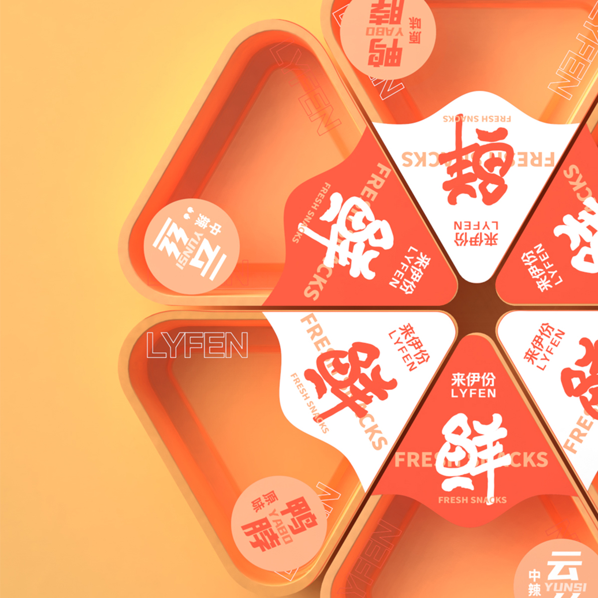 來(lái)伊份-給生活加道菜:八邊食盒,為味覺(jué)錦上添花。采用了中國(guó)傳統(tǒng)餐具錦盒的八邊造型,八也象征著八方來(lái)客,兼容并蓄,雅俗共賞的包容態(tài)度,與來(lái)伊份的品牌文化相符。底部貼紙內(nèi)附紙巾手套包,提升消費(fèi)者食用體驗(yàn)?;盍︴r食,運(yùn)用高飽和的明艷色彩和可愛(ài)年輕的鴨子形象提升視覺(jué)吸引力。
