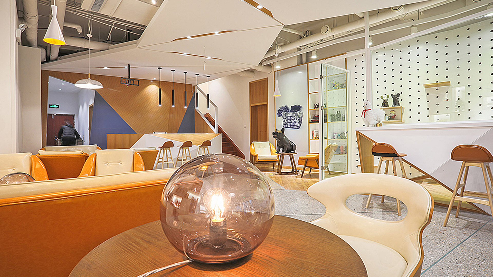 這次的設(shè)計(jì),我們將重新詮釋寵物店的含義,社區(qū)門(mén)口的寵物店不能只是一家寵物美容或者寵物用品的小超市,而更應(yīng)注重休閑生活氛圍體驗(yàn),形成養(yǎng)寵物人們之間能夠進(jìn)行話題交流的場(chǎng)所,為這些熱愛(ài)生活,熱愛(ài)寵物的人們提供家一樣的感受??臻g以暖黃色作為主色調(diào),以及一系列寵物裝飾造型,都很好的表現(xiàn)出店鋪的“溫馨度”,讓顧客到店體會(huì)到的不僅僅是專(zhuān)業(yè)、放心,更多了一份溫暖。設(shè)計(jì)師在大門(mén)出設(shè)計(jì)了一個(gè)櫥窗,偶然經(jīng)過(guò)的路人透過(guò)櫥窗,里面的溫馨場(chǎng)景一目了然。
