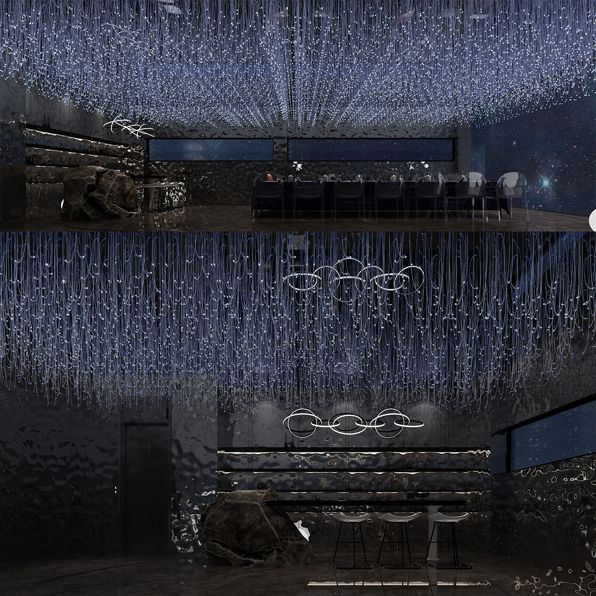 餐廳內(nèi)垂掛起無(wú)數(shù)盞LED燈,用來(lái)營(yíng)造一種夢(mèng)幻星空的環(huán)境,星光熠熠,讓你感覺(jué)到仿佛置身于“星空”之中。