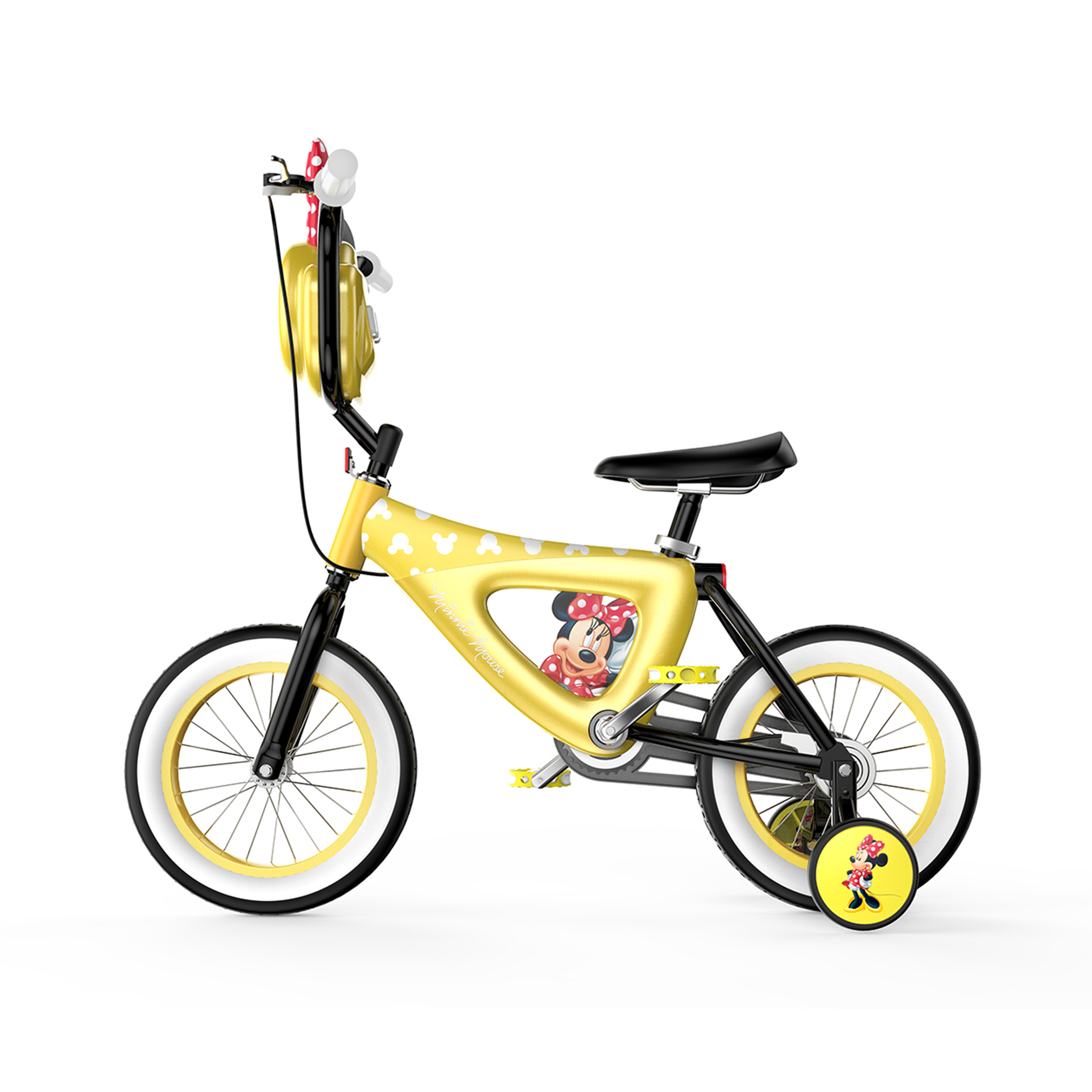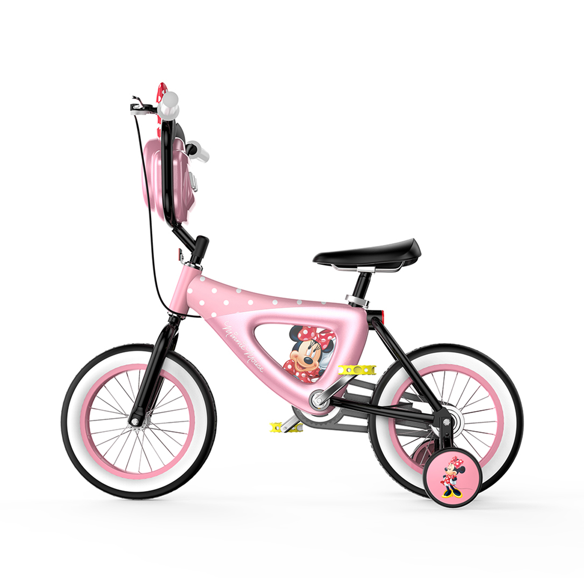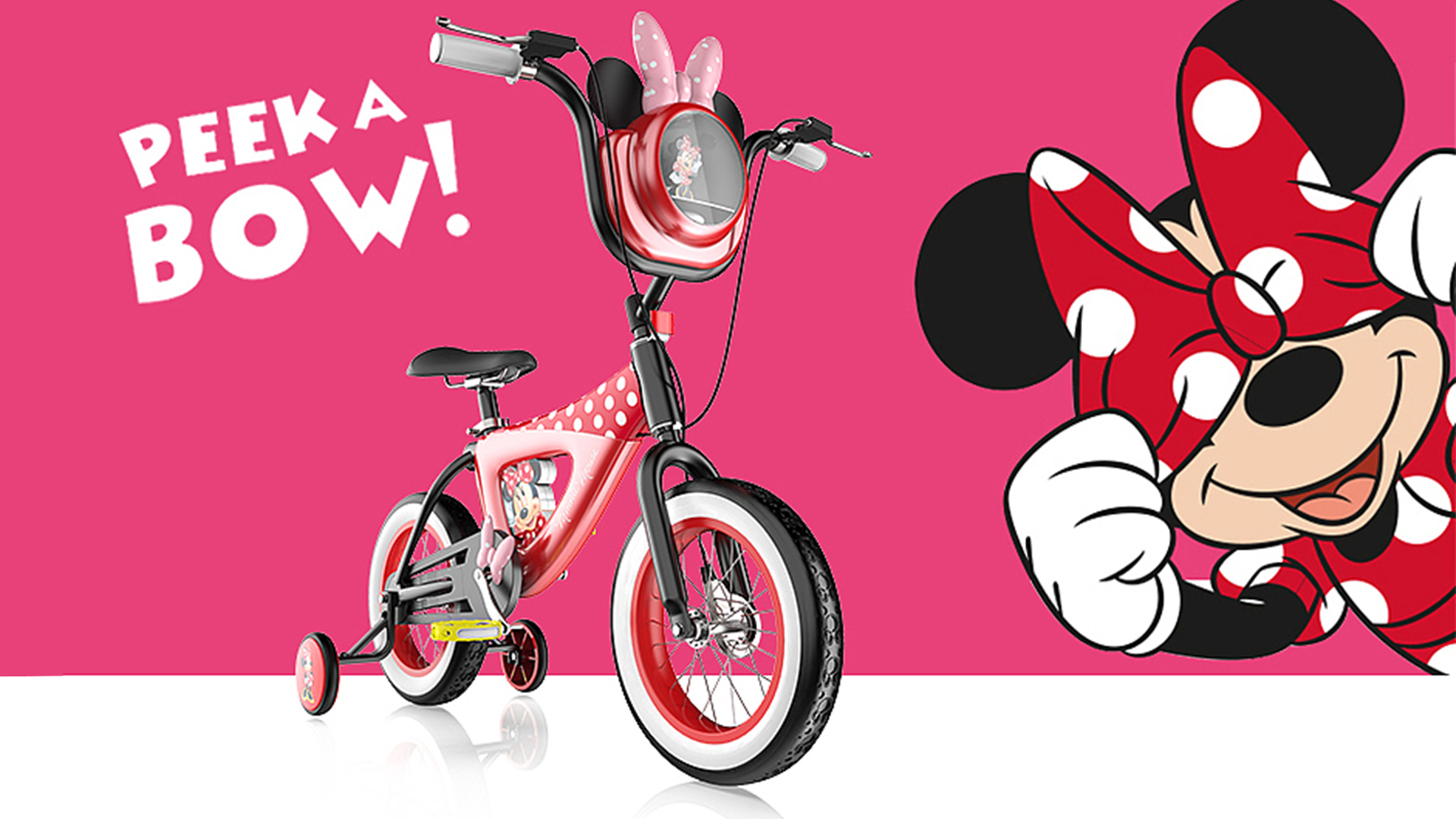 輔助輪與車架中部印有米妮肖像圖案,象征米妮始終陪隨在孩子左右,車胎印有米妮老鼠頭像紋理,象征米妮與孩子一路同行、共同成長.