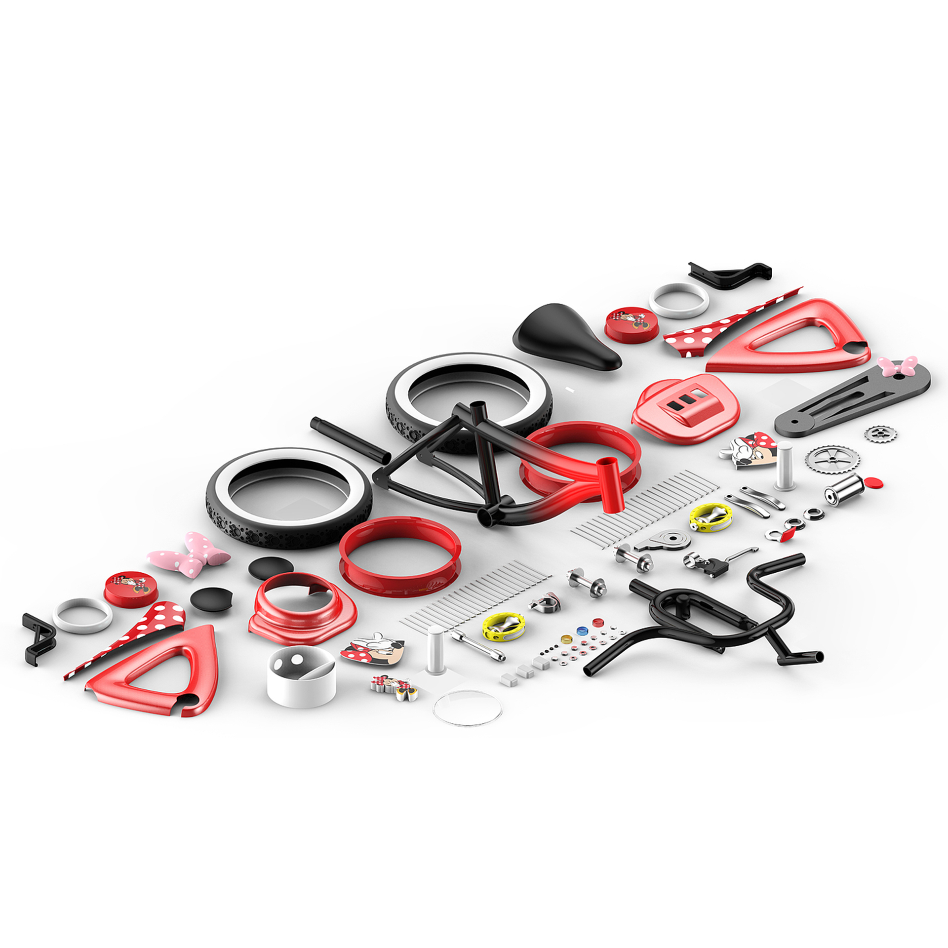 呼應(yīng)米妮充滿童趣的卡通形象,車架設(shè)計成飽滿有機的形態(tài),迎合孩子們喜歡的親和可愛風(fēng)格,配以紅色及白斑點紋理,象征米妮的紅色連衣裙,讓米妮形象融入車體的造型中,三角形穩(wěn)固設(shè)計,為孩子騎行安全多添一份保障。